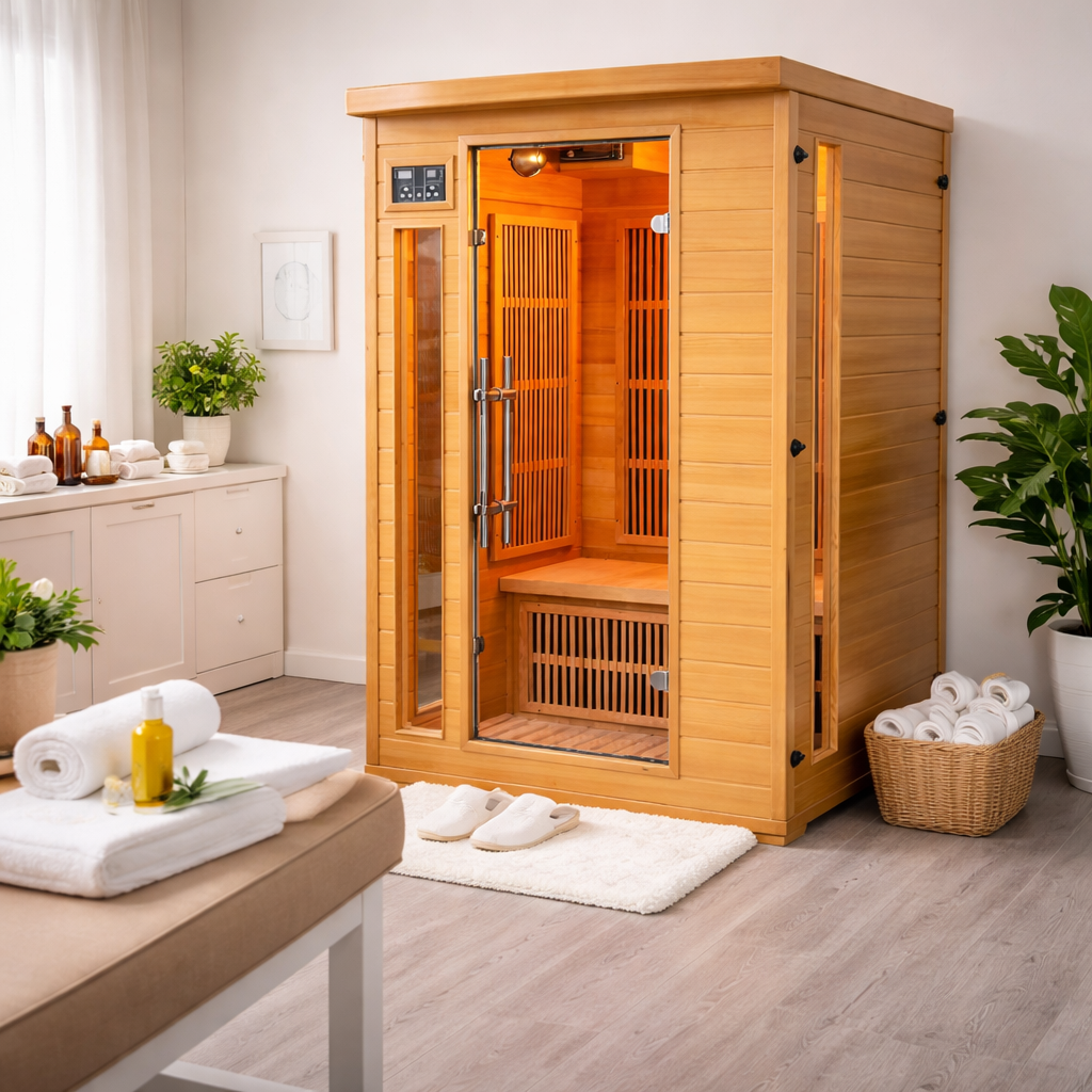 Our state-of-the-art Advance Infrared Sauna Device is designed for the ultimate relaxation and wellness experience. With a full touch screen, users can easily configure its advanced features, including solid-state far infrared panels for effective heat therapy. It also offers RED light therapy and soothing salt therapy to enhance healing. Enjoy your favorite music with the Bluetooth speaker while benefiting from Chromotherapy, which uses colored lights for mood enhancement. The integrated ozone/oxygen ionizer helps purify the air, and comfort seating accessories ensure a cozy and enjoyable sauna session.